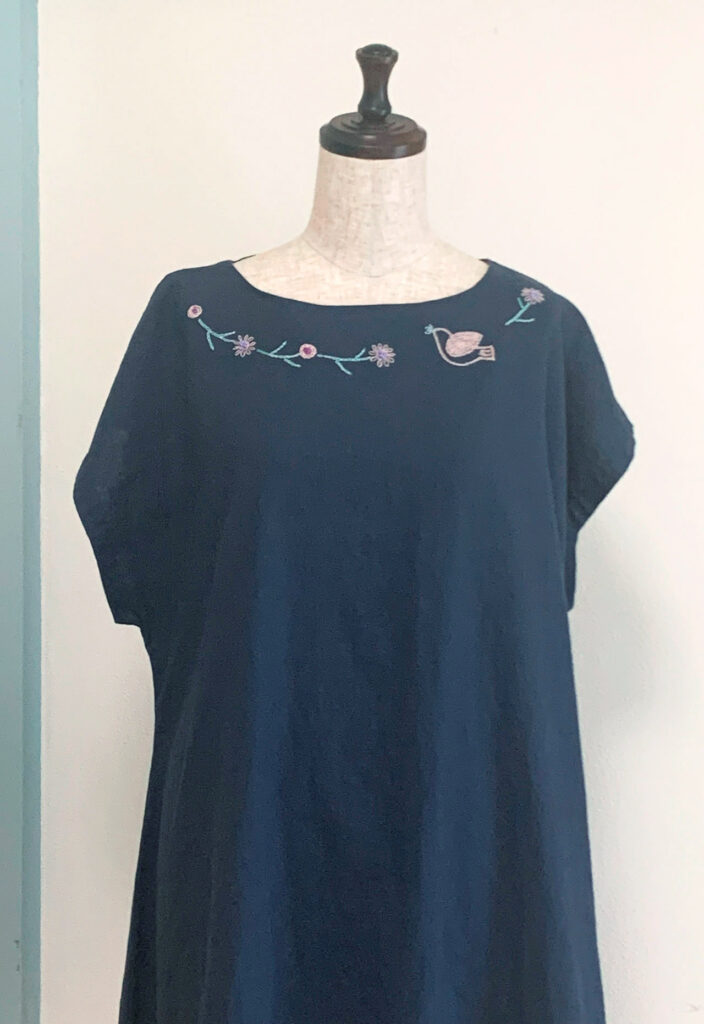 鎌倉スワニーのワゴンで見つけた麻の生地。大胆な柄だけど、色合いが爽やかで気に入ってます。